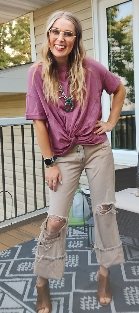 Twisted knot front detail. Looser fitting but fits true to size. Beautiful fun color for fall!